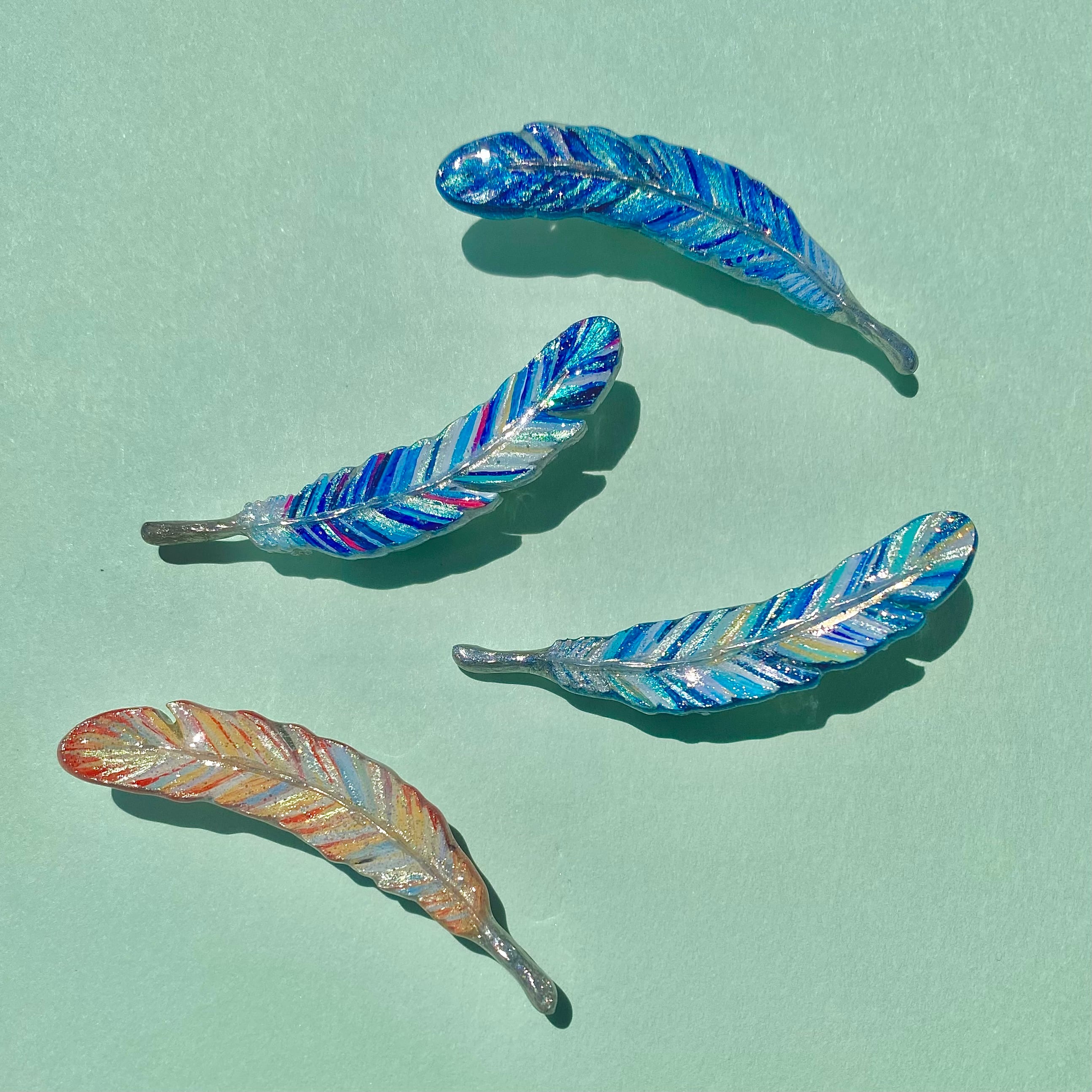 キラキラと角度によって表情が変わる羽ブローチです。 日々のコーディネートにアクセントを加え、日常をちょっぴり楽しくしてくれます。 手描きの一点物作品の為、一つ一つ表情が異なります。 手のひらの上でキラキラ輝く様子を眺めたり、あなただけの作品をお楽しみください! ★こちらの商品は受注販売となります。 注文からお届けまで2週間適度頂く場合がございます。ご了承ください。 ★お好みの色合いに作成致します。 注文画面にて詳細な色のイメージを指定して頂く事も出来ます。 ※軸部分はシルバーカラーになります。 ⬛︎大きさ(約) 縦:15mm 横:60mm プレート部厚み:4mm ⬛︎素材 樹脂 アクリル絵の具 プラスチック板 ■金具ピン 素材:合金 ※金具は壊れやすいため、強い力を加えないよう、取り扱いには十分ご注意ください。