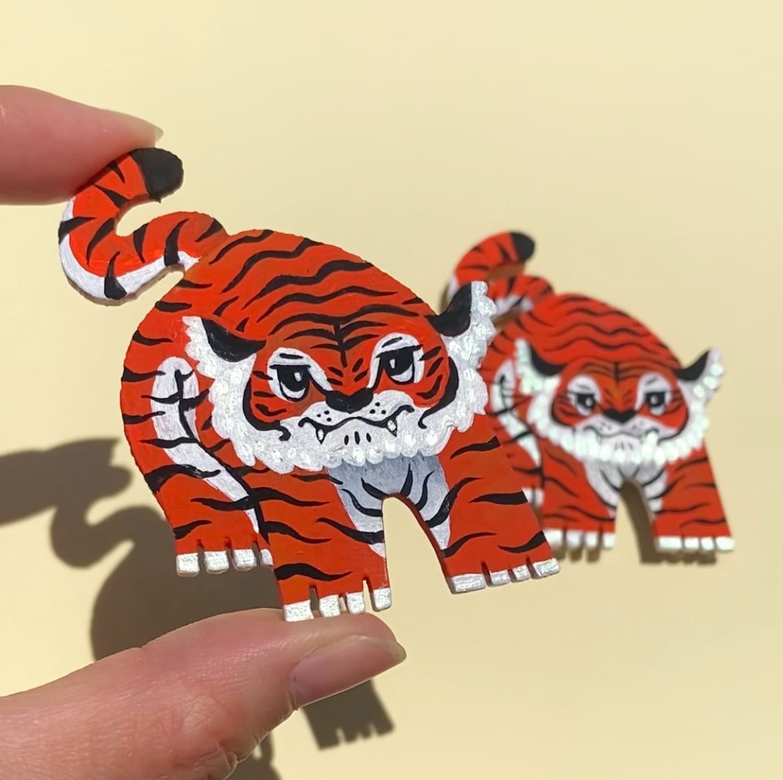 見つめられるとつい微笑んでしまう、表情豊かなトラくんブローチです。 手描きの一点物作品の為、一つ一つ表情が異なります。手のひらの上でキラキラ輝く様子を眺めたり、あなただけの作品をお楽しみください。 ★こちらの商品は受注販売となります。 注文からお届けまで2週間適度頂く場合がございます。ご了承ください。 ⬛︎大きさ(約) 縦:60mm 横:50mm プレート部厚み:4mm ⬛︎素材 樹脂 アクリル絵の具 プラスチック板 ■金具ピン 素材:合金 ※金具は壊れやすいため、強い力を加えないよう、取り扱いには十分ご注意ください。