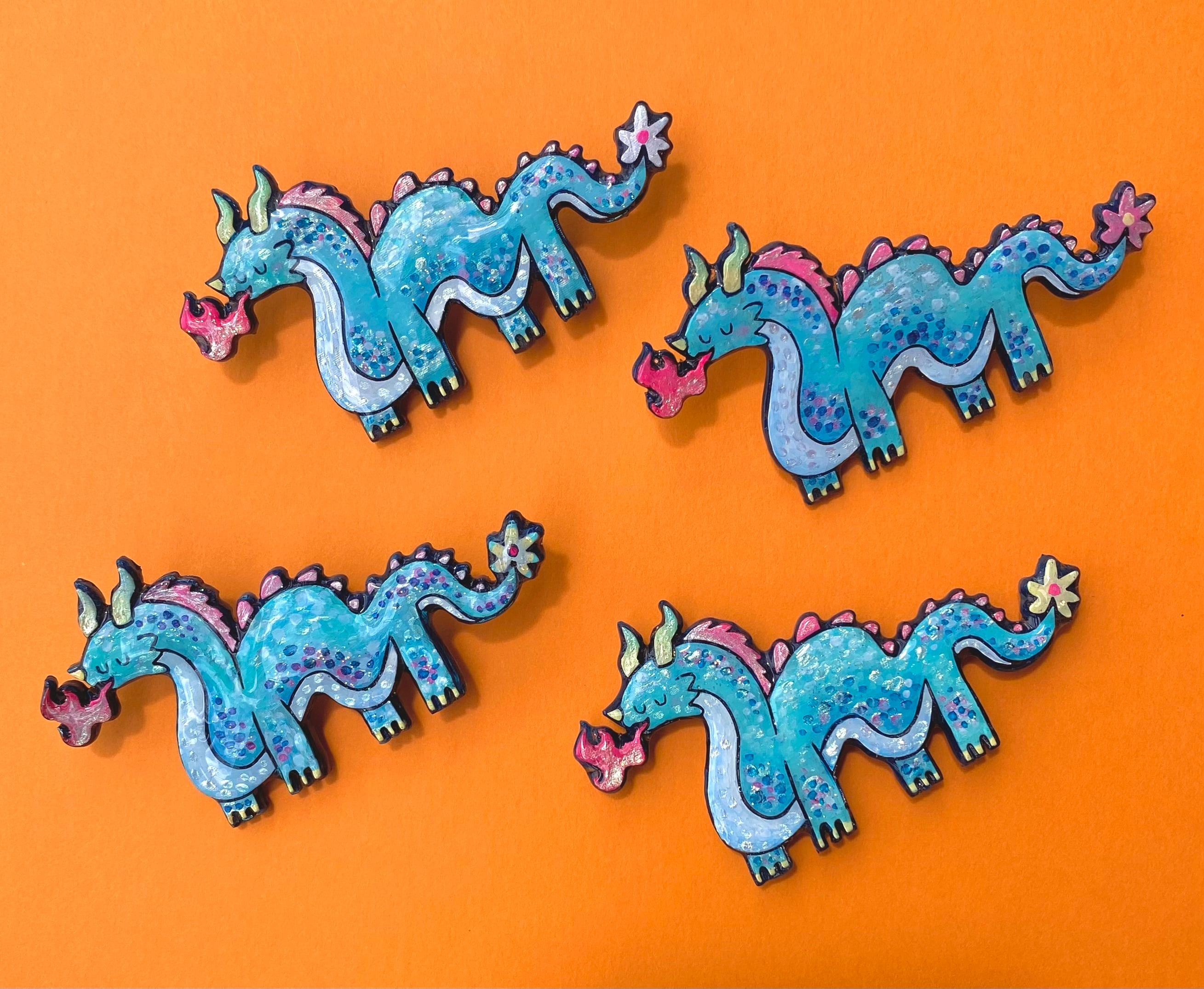 しっぽのお花がチャームポイント。日常をちょっぴり楽しませてくれる、心優しいドラゴンくんのブローチです。 手描きの一点物作品の為、一つ一つ表情が異なります。キラキラ輝く様子をお楽しみください。 ★こちらの商品は受注販売となります。 注文からお届けまで2週間適度頂く場合がございます。ご了承ください。 ※しっぽのお花の色はランダムになります。 指定がある場合は、注文画面のメッセージにてお好きな色をお伝え下さい。 ⬛︎大きさ(約) 縦:40mm 横:75mm プレート部厚み:約4mm ⬛︎素材 樹脂 アクリル絵の具 プラスチック板 ■金具ピン 素材:合金 ※金具は壊れやすいため、強い力を加えないよう、取り扱いには十分ご注意ください。